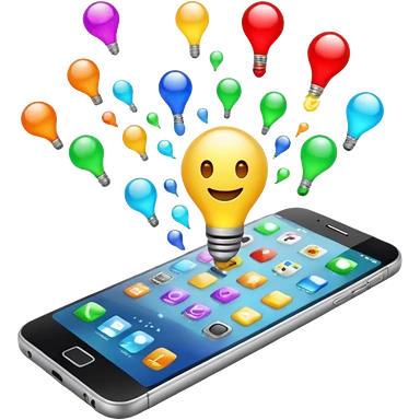 Generate a realistic emoji of a smartphone where a lot of things like data, ideas, inventions and creative stuff coming out of it. Whats coming out of it spreads in the air emoji