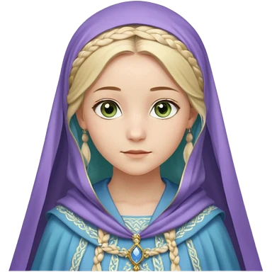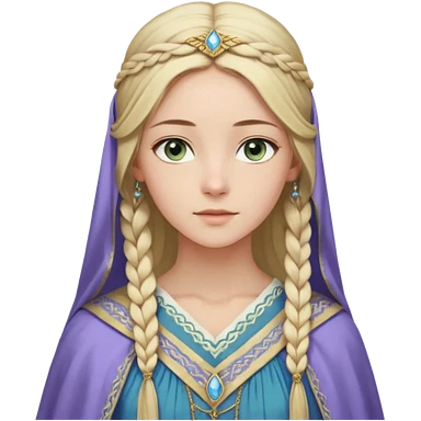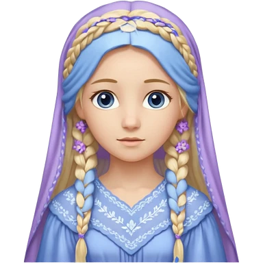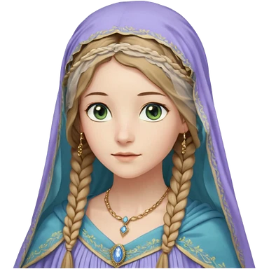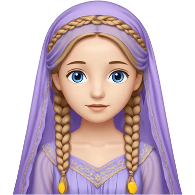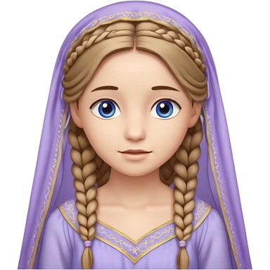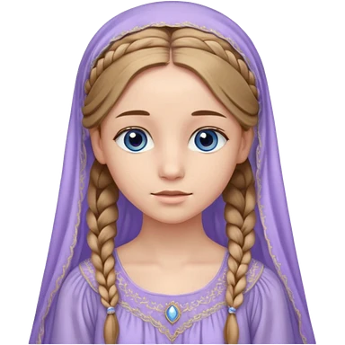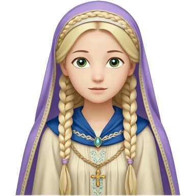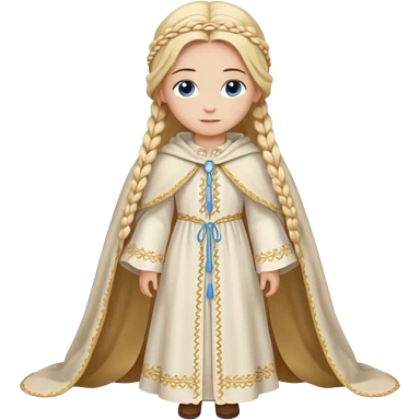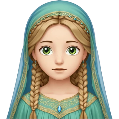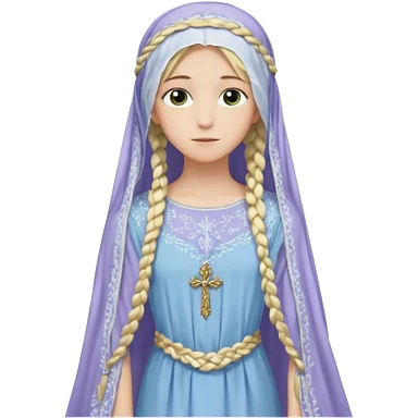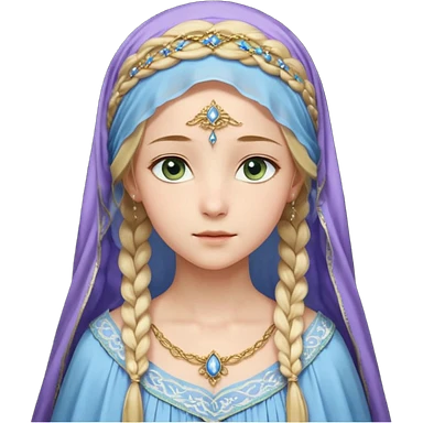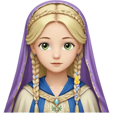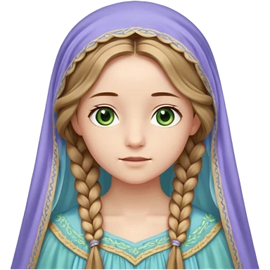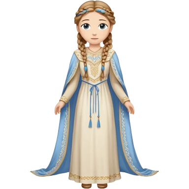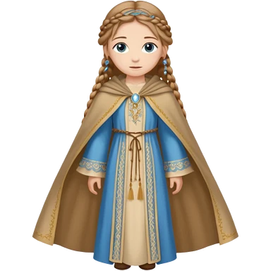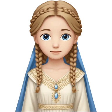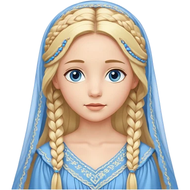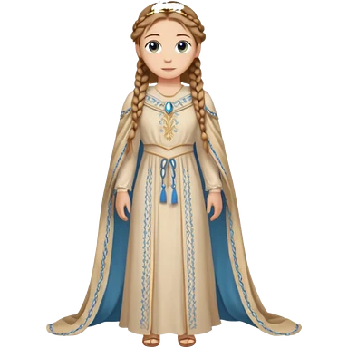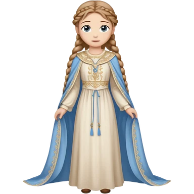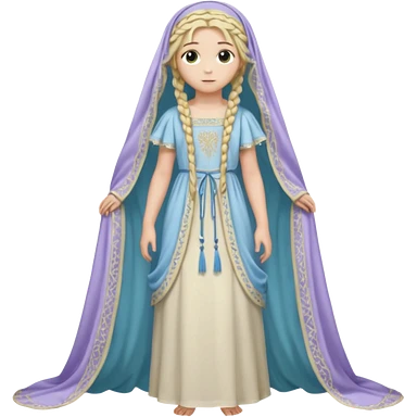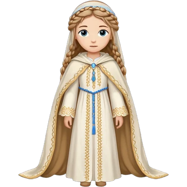 Joven de unos 20 años, de aspecto dulce y elegante. Piel clara, ojos (pueden ser azules o verdes) Rubio o castaño claro, largo, con trenzas o velo. Vestido largo de tonos suaves (blanco, azul o lavanda), con bordados dorados; un manto o toca fina cubriendo la cabeza. se vea todo el cuerpo emoji | AI Emoji Generator