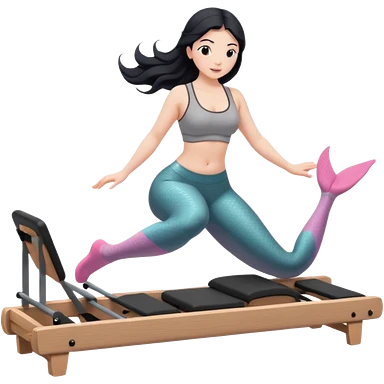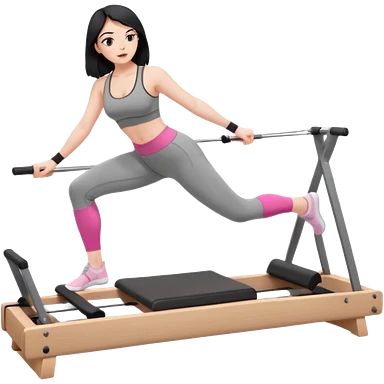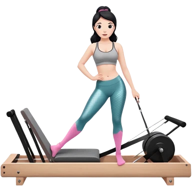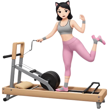 Fair-skinned black hair girl wearing grey workout set in leggings and bra doing pilates on a reformer emoji