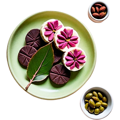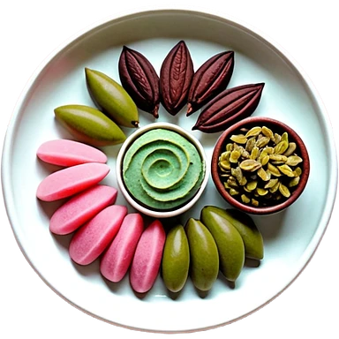 Una composición de arte en miniatura, estilo flat lay: un trozo de manteca de Karité o cacao cruda con una pequeña ramita de oliva y pétalos de rosa seca alrededor. Colores: tonos tierra, verde oliva y crema. Estilo: orgánico y de estudio fotográfico. Fondo suave. emoji
