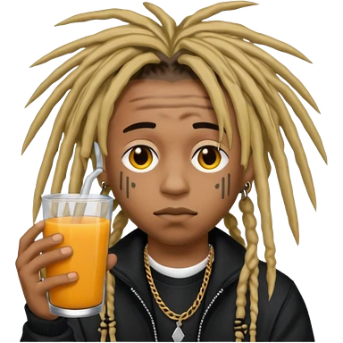 Juice WRLD with purple dreadlocks, 999 tattoo, gold chain, and hoodie emoji