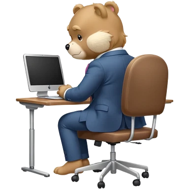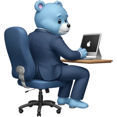 Care bear sad in suit back view, sit on a chair, working on a computer, with a big desk emoji