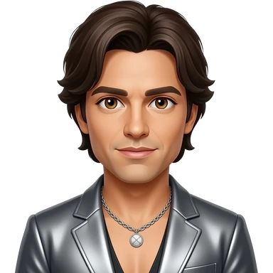 Enrique Iglesias with brown eyes, dark brown hair, gray metallic latin pop outfit, necklace emoji