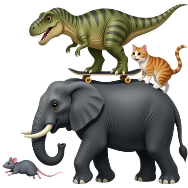 Dinosaur on a skateboard and standing on the black color elephant and cat is coming from behind rat is jumping on the front emoji