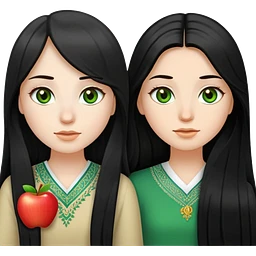 create an emojis, apple type like, two girls : 1st central Asian with straight black long hair, pale, black eyes. Second one is more European looking, brown/ kinda gold hair, just a little bit slightly wavy, green eyes emoji