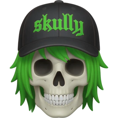 Create a skeleton head wearing a black baseball cap that says "skully" in green lettering, with green emo hair emoji