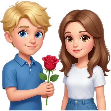 A blonde hair blue eyed boy giving a light brown haired girl with Hazel eyes Roses emoji
