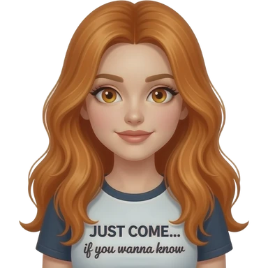 sexy girl with overlong ginger hair and ginger eyes a top with JUST COME... if you wanna know written on it emoji