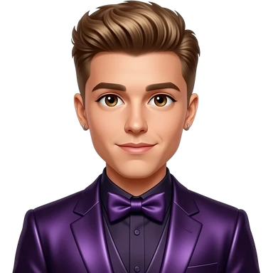 Justin Bieber with brown eyes, golden brown hair, dark purple metallic suit with bow tie, short earrings emoji