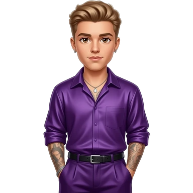 Justin Bieber with brown eyes, golden brown hair, purple metallic shirt, silver necklace and short earrings emoji