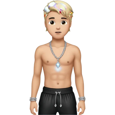 Justin Bieber with metallic black pants, shirtless with necklace emoji