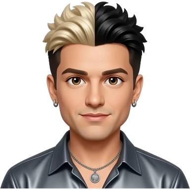 Chris Kirkpatrick from NSYNC with brown eyes, black 90s pineapple ponytail hair with white-blond highlights, dark grey metallic shirt, necklace and earrings emoji