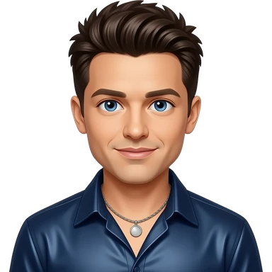 JC Chasez from NSYNC with blue eyes, dark brown 90s spiky hair, dark indigo metallic shirt, necklace emoji