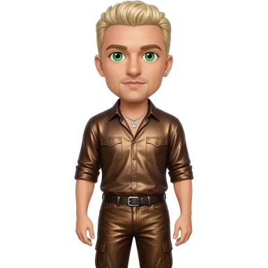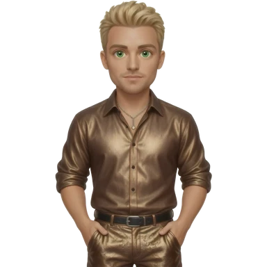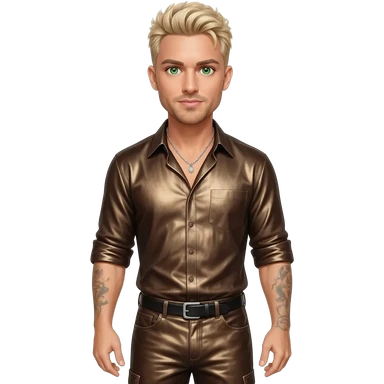Lance Bass from NSYNC with green eyes, blonde hair, coffee brown metallic shirt, sepia metallic long baggy pants, silver necklace emoji