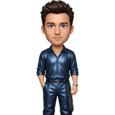 Justin Timberlake from NSYNC with blue eyes, golden brown hair, long steel blue metallic shirt, light steel blue metallic long baggy pants, silver necklace emoji | AI Emoji Generator