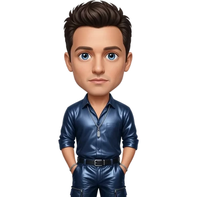 JC Chasez from NSYNC with blue eyes, dark brown hair, midnight blue metallic shirt, midnight blue metallic baggy pants, silver necklace emoji
