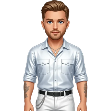 Justin Timberlake with blue eyes, light brown hair, white metallic sleeves shirt, white metallic baggy pants with chain, necklace and short earrings emoji