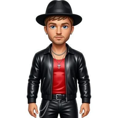 Justin Timberlake with blue eyes, light brown hair, red metallic sleeveless shirt, black hat, black metallic open shirt, black metallic baggy pants with chain, necklace and short earrings emoji
