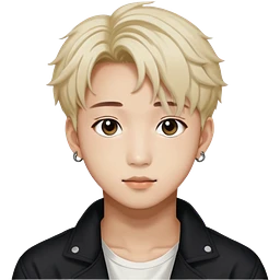 Blonde K-pop idol with wavy hair, almond eyes, natural makeup, and confident expression. Black background with lightning symbol and pink. emoji