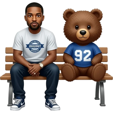 Kanye west in a bench next to the dropout bear from the album the college dropout emoji