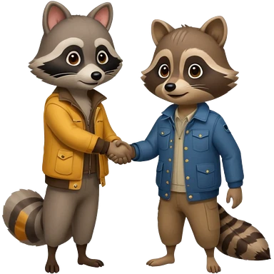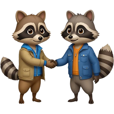person and racoon standing full body looking at each other and giving a hand shake. cartoon style emoji