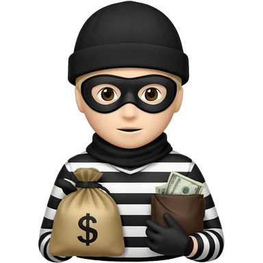 A emoji of a person wearing a black and white robber outfit and a black winter hat and a black mask and a Money Bag emoji