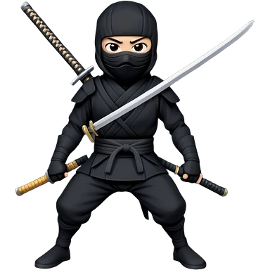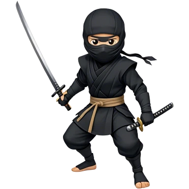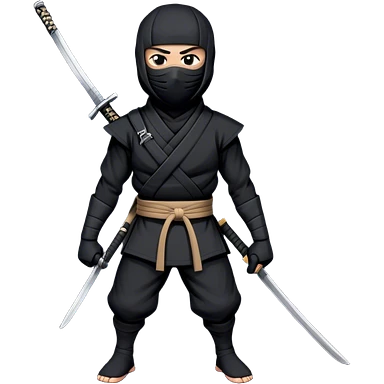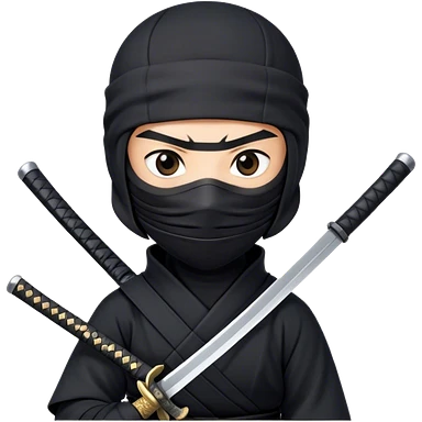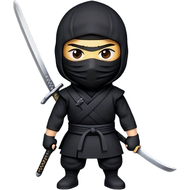 A emoji cartoon-style digital illustration of a ninja dressed in a half black outfit with a face mask, leaving only the eyes visible. The ninja has a serious and focused expression. A katana sword is strapped to their back, with the handle visible over one shoulder. The background is plain white emoji