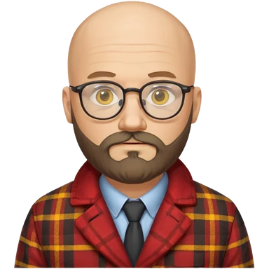 Un profesor calvo, que tenga barba abundante, lleva gafas con el cristal de color amarillo y un abrigo de cuadros rojo emoji