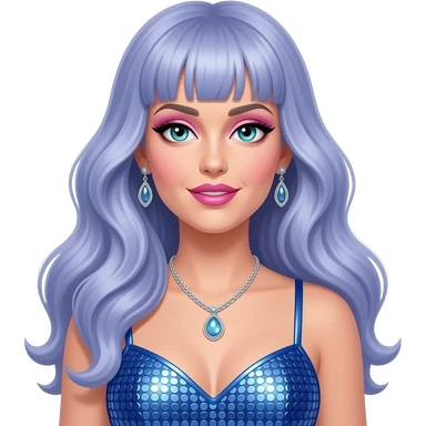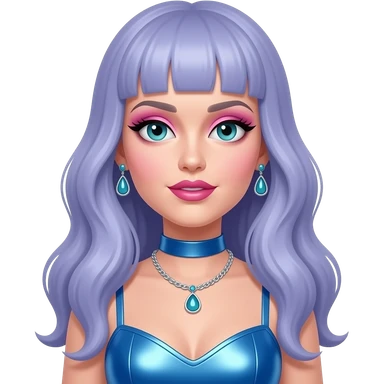 Katy Perry with teal eyes, long periwinkle hair, pink eyeshadow and lipstick, blue metallic pop outfit, necklace and earrings emoji