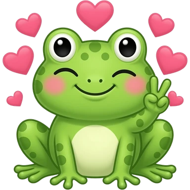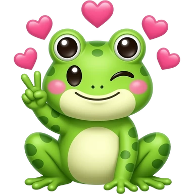 kawaii frog winking and holding up the peace sign, with hearts around her head emoji | AI Emoji Generator
