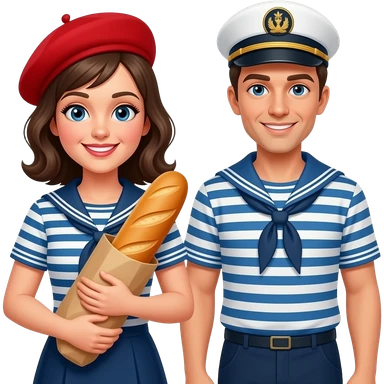 A French woman with a red beret, a sailor and a baguette of bread emoji