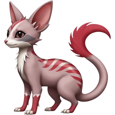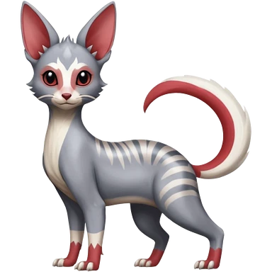Minccino-Lykoi-Emolga-Sphynx-Linoone-Zangoose-fusion-hybrid-animal-Fakémon-creature, full body, thin long sleek scaly tail, intricate markings emoji