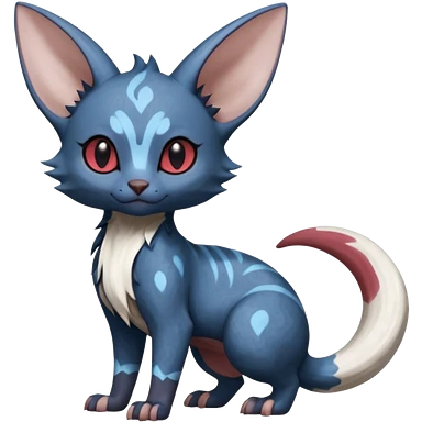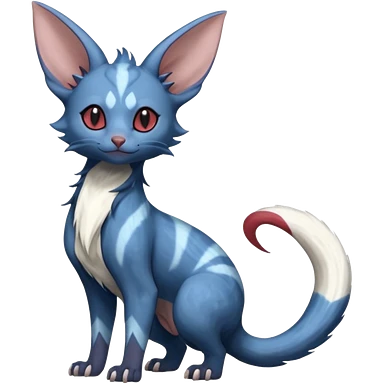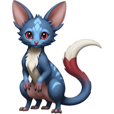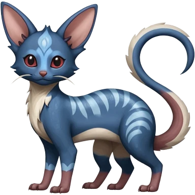 Dark Brown-Oily deep-blue-glittery Minccino-Lykoi-Emolga-Sphynx-Linoone-Zangoose-fusion-hybrid-animal-Fakémon-creature, full body, thin long sleek scaly tail, with intricate markings emoji