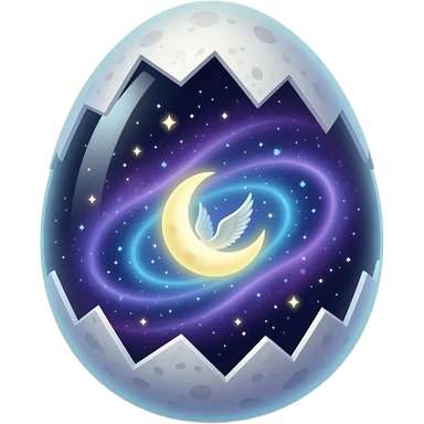 a moon‑born cosmic egg glowing with violet stardust, a winged crescent Moon within a swirling nebula, tiny wandering lights suspended inside its shell, isolated object, transparent background emoji