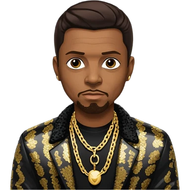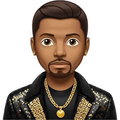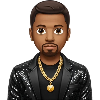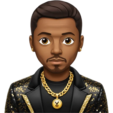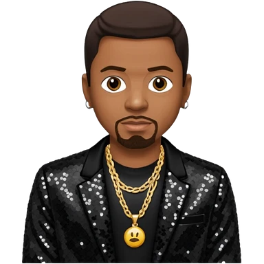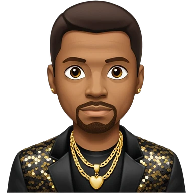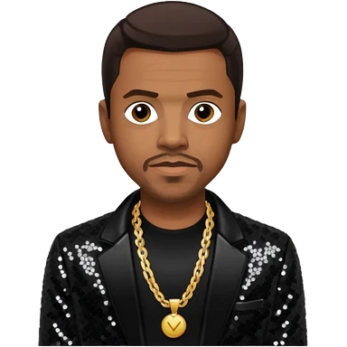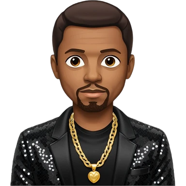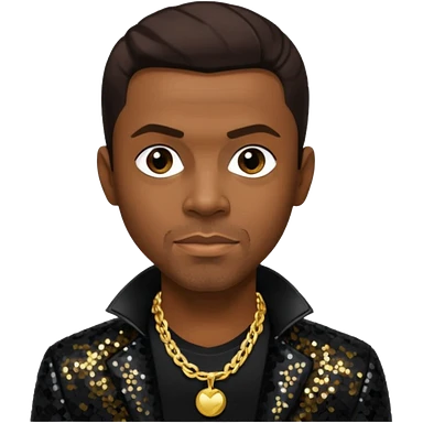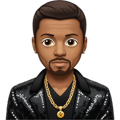 Keith Sweat (b.1961) with dark brown hair, black sequin jacket, black shirt with necklace emoji