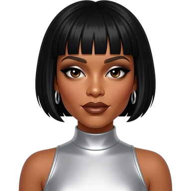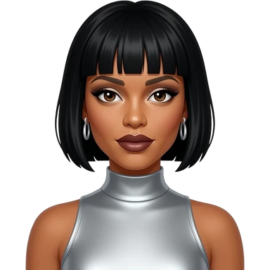 Kelly Rowland from Destiny's Child with dark brown eyes, black eton crop hairdo, silver eyeshadow, dark brown lipstick, silver high neck dress, silver earrings emoji