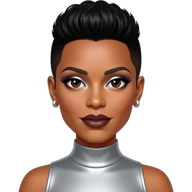 Kelly Rowland from Destiny's Child with dark brown eyes, black faux hawk hairdo, silver eyeshadow, dark brown lipstick, silver high neck dress, silver earrings emoji
