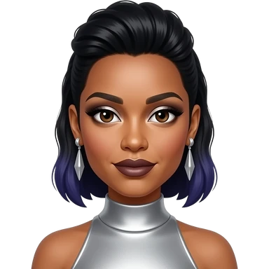 Kelly Rowland from Destiny's Child with dark brown eyes, black faux hawk hairdo with dark indigo highlights, silver eyeshadow, dark brown lipstick, silver high neck dress, silver earrings emoji