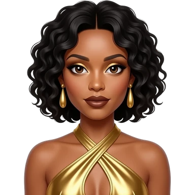Kelly Rowland from Destiny's Child with dark brown eyes, long black short hair, gold eyeshadow, bronze lipstick, gold metallic halter dress, gold earrings emoji