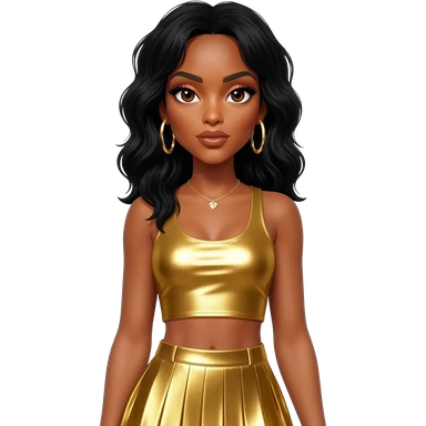 Kelly Rowland with black hair, gold metallic crop top, gold metallic skirt, gold earrings emoji