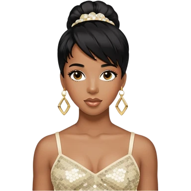 Kelly Rowland with black hair, ivory sequin crop top, ivory earring emoji