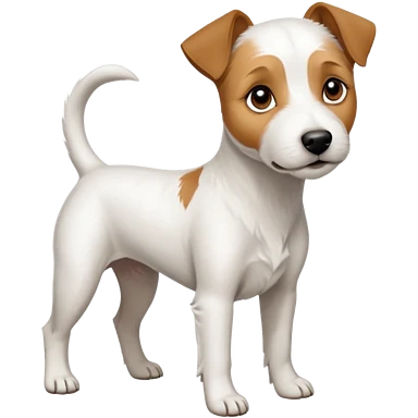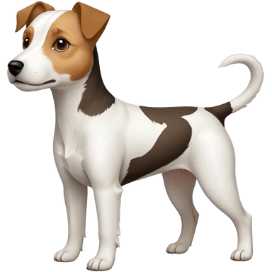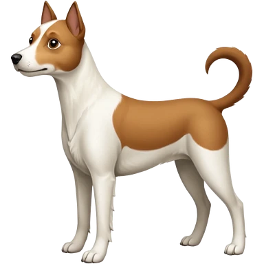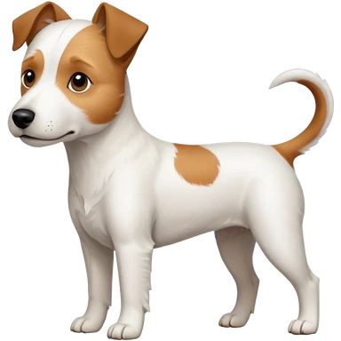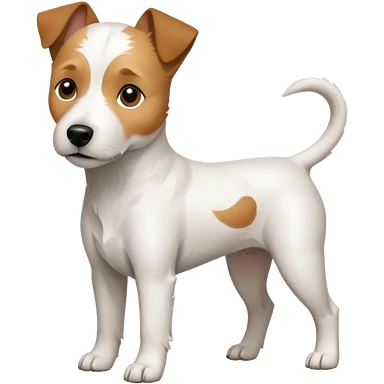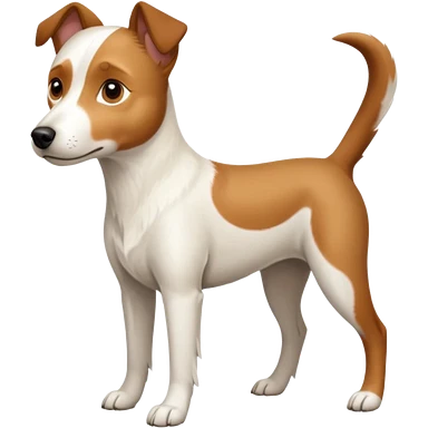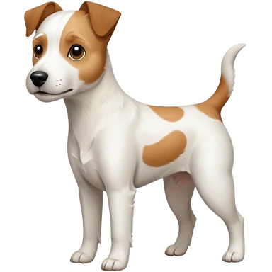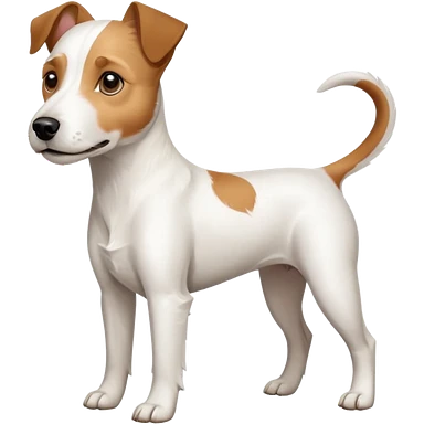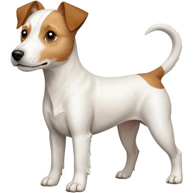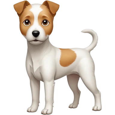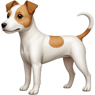 a full body white parson russell looking dog the size of a kelpie with light brown ears and a light brown patch on one eye and a large snout emoji