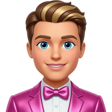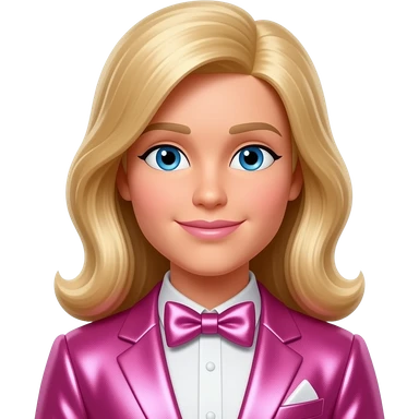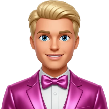 Ken from Barbie and Friends with blue eyes, blonde hair, pink metallic suit with bow tie emoji
