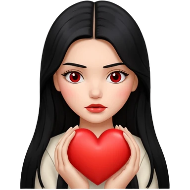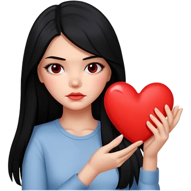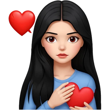A Kendall Jenner with long black hair is sad and holds a red heart in her hands emoji