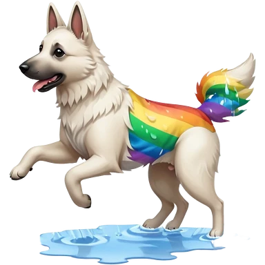 White belgian Shepard jumping over Rain puddles. There is a rainbow in the sky emoji