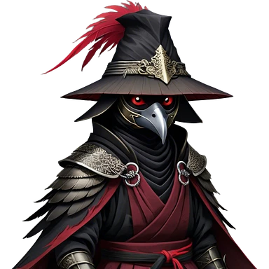 A fierce Kenku samurai with sleek black feathers, piercing crimson eyes glowing under the shadow of his straw hat. His sharp beak is partially covered by a black cloth mask, adding to his air of mystery. He wears layered black and crimson armor, intricate silver engravings etched into the metal plates. A long, tattered cloak billows behind him, worn from countless battles. His clawed hands grip the hilt of a curved katana, its polished blade reflecting the moonlight. Wisps of mist swirl around his taloned feet as he stands motionless emoji