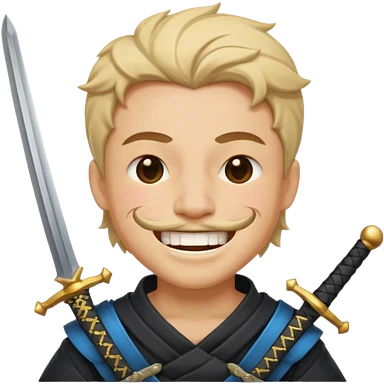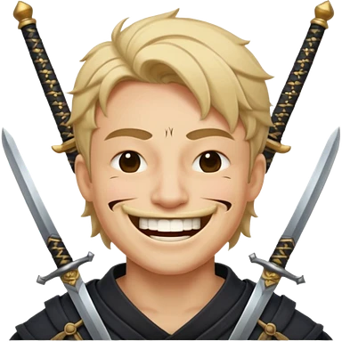 Haz que tenga una sonrisa epica una cicatriz en el ojo serrado y una espada entre los dientes y dos más a cada lado emoji