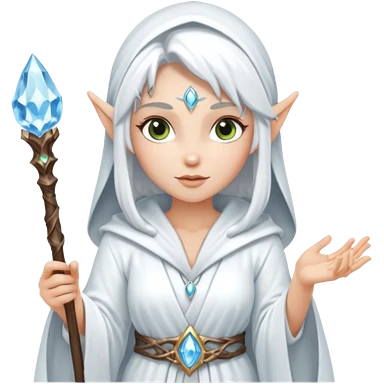 { "type": "human", "look": "snow elf sorceress, white robe, silver staff, ice gem top", "description": "a snow elf sorceress in a white robe with a silver staff topped by an ice gem" } emoji