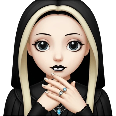 zombie boy with emo spiky hair, white skin, and white eyes; an open smile, and bloodied teeth; emoji