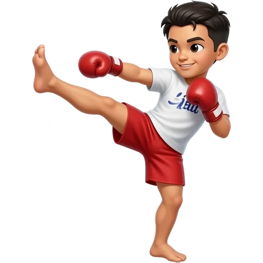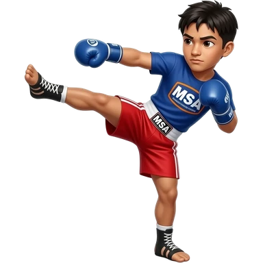 Thai boxer front kick teep red shorts and t shirt with msa logo emoji